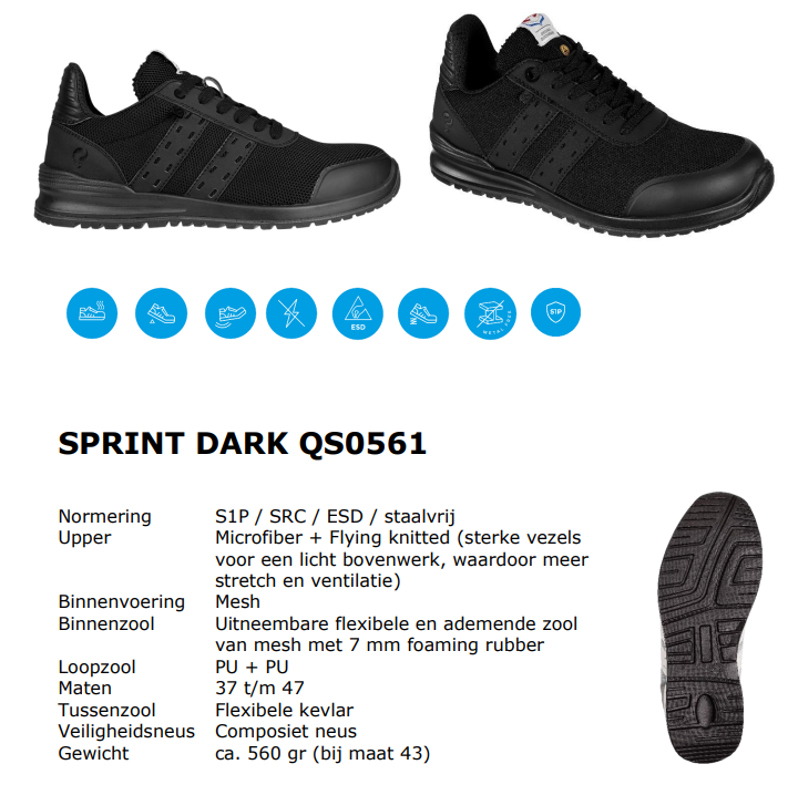 De Q1905 Sprint Dark is een van de modellen in de serie veiligheidsschoenen van Q1905. Dit lage model is geschikt voor veiligheidsklasse S1P. Het model biedt de bescherming die bij een veiligheidsschoen van belang is. De Q1905 Sprint is met zijn uitstraling bijna niet te onderscheiden van sportschoenen. De schoenen zijn staalvrij, licht, flexibel en comfortabel door de combinatie van microfiber en flying knitted (materiaal gemaakt van sterke maar lichte garens die geweven zijn tot een eendelig bovenwerk). Op deze manier combineren we veiligheid met sportiviteit.