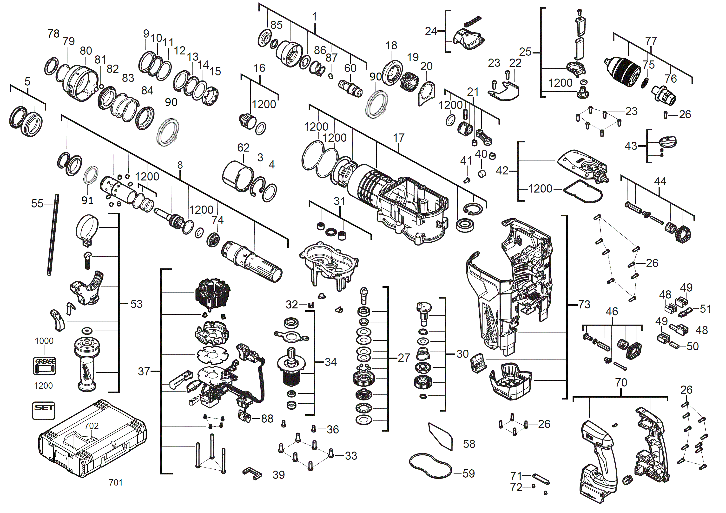 - Bevat 4 standen: boren met slag, boren, beitelen en vrijloop voor maximale veelzijdigheid