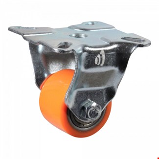 Zwenkwielen met een verzinkte gaffel uit geperst staal met plaat- of boutgatbevestiging. Uitgevoerd met oranje TPU band Shore 92 + / - 2 met gietijzeren velg. Voorzien van draaikrans met dubbele kogellager.